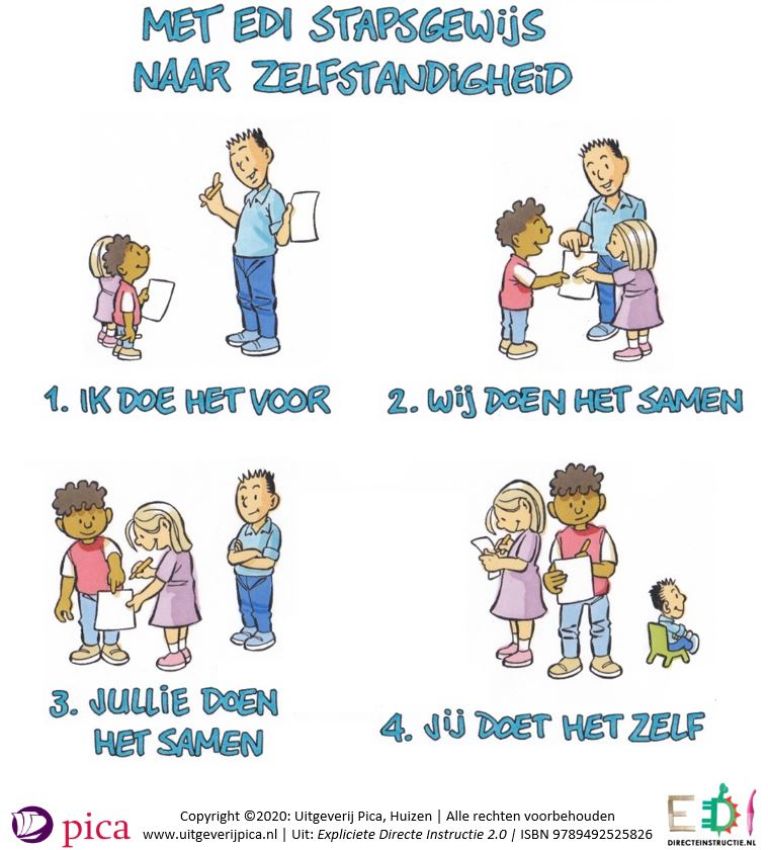 - Begeleide inoefening. De leerlingen nemen het toepassen van de leerstof over. Ondertussen controleert de leerkracht telkens of ze het correct doen en begrijpen.